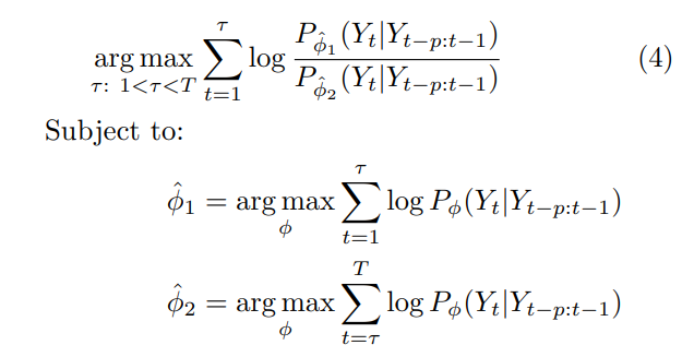 은 변화점 개수 k, 변화점 위치 τ\, 매개변수 벡터 ϕ를 명시적으로 포함하는 piecewise stationary model 을 나타낸다.