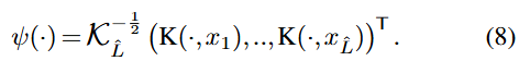 식 7, 최적화 문제를 Empirical expectaion으로 표현하고, Nyström 근사를 취하면 f^은 다음과 같은 형태로 취해진다.