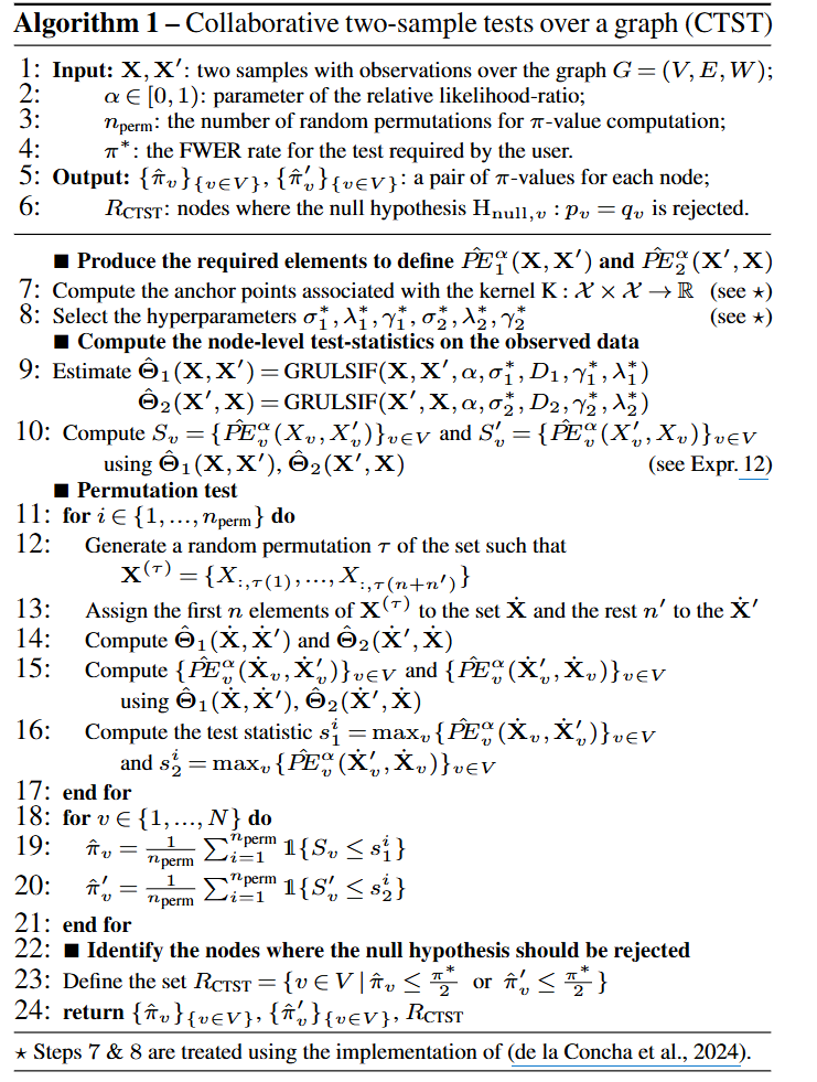 Fig1은 이러한 방법을 설명한다. 기존방법들과 다르게 CTST는 모든 노드 수준의 테스트 통계량을 공동으로 추정하고 연관적인 방식으로 식별하여 통합된 추정과 기각을 함께 제공한다는 것이다. ϕ-divergence estimation, Kernel Methods, Multitasking, 특히 GRULSIF framework (de la Concha et al., 2024)를 이용하여 p와 q의 차이를 정교하게 정량화한다. 또한 graph smoohtness 가정을 통해 collaborative estimation은 연결된 노드 u와 v에 대한 테스트 통계량의 유사성을 강화한다. 노드 수준의 테스트 통계량에서 유도된 규칙은성은 효율적으로 k-Family-Wise Error Rate(FWER)을 제어하는 permutation test에 의해 활용되며, 노드를 식별한다 (이를 통해 개별 추정의 에러를 줄임)