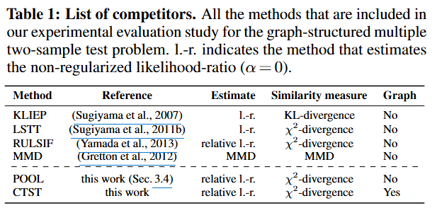 공정한 비교를 수행하고 비모수적 방법의 유연성을 유지하기 위해, 우리는 커널 방법(Kernel Methods)을 기반으로 구축된 추정 접근법에 초점을 맞춘다. 비교 대상은 LRE 기반 비모수적 알고리즘(테스트 통계량이 ϕdivergence 추정량에 해당하는 경우)과, 비모수적 통계 검정의 최신 기술(state-of-the-art)로 간주되는 MMD(Maximum Mean Discrepancy)를 기반으로 한 커널 방법(Gretton et al., 2012)이다. 표 1(Tab. 1)은 비교된 모든 방법을 보여주며, CTST만이 그래프 구조를 통합하고 있음을 알 수 있다.