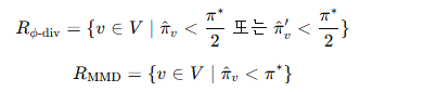 -divergence 기반 방법들의 비대칭성(non-symmetricity) 문제는 섹션 3.2에서 CTST에 대해 사용한 방식과 동일하게 해결하며, p,q 및 q,p 를 비교한다. 그런 다음, 사용자가 제공한 임계 비율 π∗에 따라, 기각된 가설 집합을 다음과 같이 정의한다.