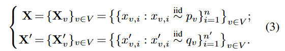 Undirected & Postive weight를 가지는 그래프 G=(V,E,W)에 관하여, 각 노드 v는 두개의 알려지지 않은 pdf p와 q로부터 유래된 n + n'의 iid 관측치를 가지고 있다고 가정하자. 관측값은 다음과 같다.