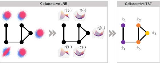 Figure 1: Collaborative multiple two-sample testing (CTST) based on collaborative LRE over a graph Fig1: 왼쪽 그림은 각 그래프 노드 v에서 두가지 확률 밀도 함수인 파란색 p와 분홍 q에서 얻은 관측값을 바탕으로