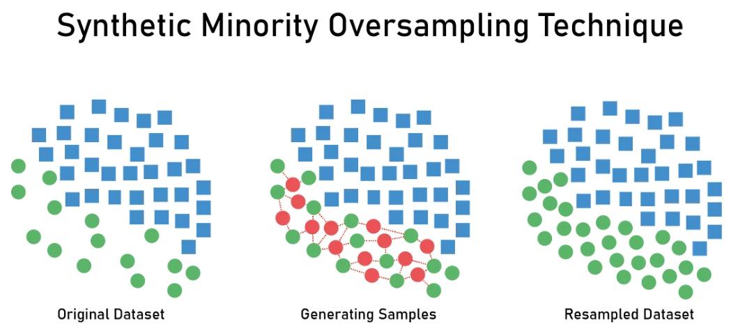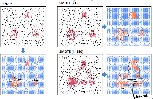 출처: https://jaylala.tistory.com/entry/%EB%B6%88%EA%B7%A0%ED%98%95%EB%8D%B0%EC%9D%B4%ED%84%B0%EC%B2%98%EB%A6%AC-%EC%98%A4%EB%B2%84%EC%83%98%ED%94%8C%EB%A7%81Oversampling-SMOTE SMOTE 알고리즘은 minority class의 데이터를 합성하여 샘플링하느 방법이다