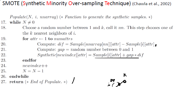 18번째 줄을 보면, 샘플 i에 대하여 k개의 인접이웃을 찾고 이 중 하나를 골라 nn이라고 하자(이는 모두 Minority class sample의 집합의 원소들에 관하여 이루어진다)