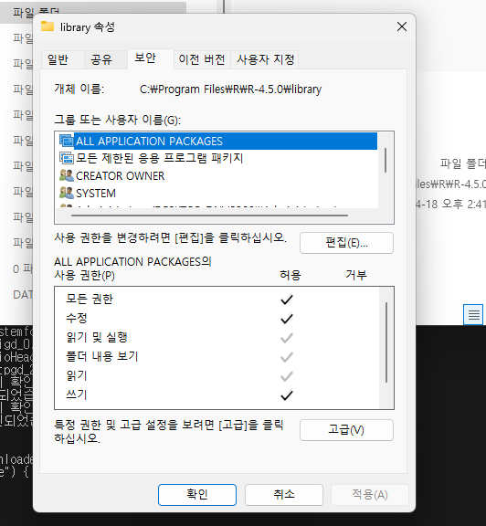2. 1로 라이브러리서버패키지 설치하고나면 R이 설치된 경로의 library 폴더의 속성에서 권한을 부여해준다.