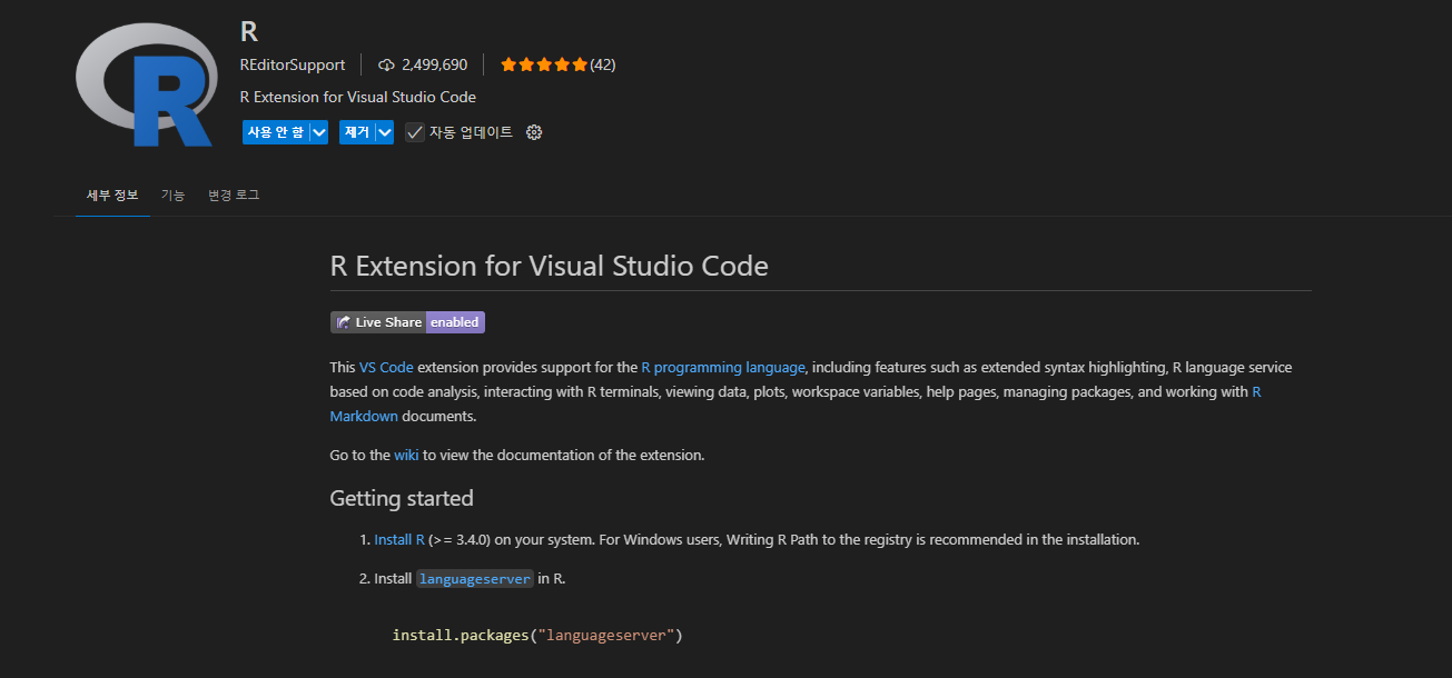 install.packages("languageserver")이후 Extension 설치를 진행, R extension을 설치한다.