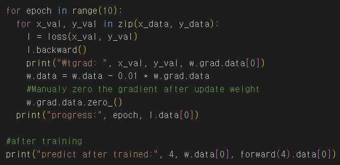 마지막으로 w의 gardinet값을 초기화시켜준다(다음 grad 계산을 위해)