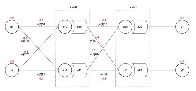 우리는 2layer임으로 $y_1$과 $y_2는$a_{20}$,$a_{21}$과 같음으로 이를 이용해 loss function에 따른 Loss값을 구할 수 있다.