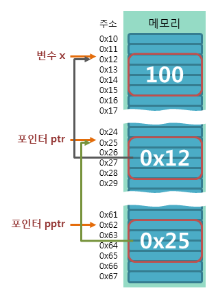 int num = 10; // 변수 선언 int* ptr_num = # // 포인터 선언 int** pptr_num = &ptr_num; // 포인터의 포인터 선언 printf("변수 num가 저장하고 있는 값은 %d입니다.\n", num); printf("포인터 ptr_num가 가리키는 주소에 저장된 값은 %d입니다.\n", *ptr_num); printf("포인터의 포인터 pptr_num가 가리키는 주소에 저장된 포인터가 가리키는 주소에 저장된 값은 %d입니다.\n", **pptr_num); pintf("포인터 ptr_num의 주소는 %d입니다.\n", *pptr_num);void 포인터
