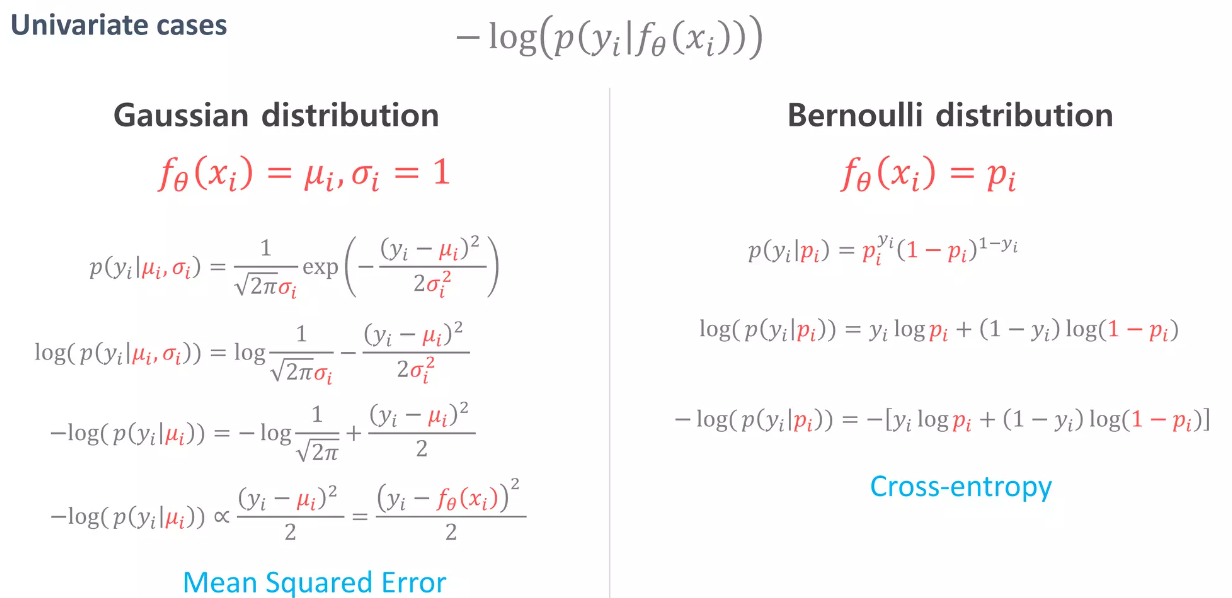 이 때 그 분포를 가우시안으로 보느냐(연속), 베르누이로 보느냐(이산)에 따라서 손실함수의 식이 각각 다르게 유도되는 것이다.