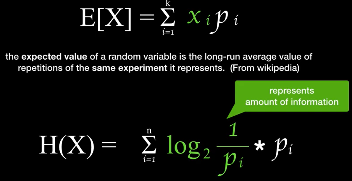 출처: https://www.youtube.com/watch?v=CdH7U3IjRI8 즉, 정보의 양인 log2(1/pi)에 관한 기대값이라고 생각하면 된다. 해당 수식에서 역수는 위에서 말한 정보표현의 길이의 개념과, log는 각 사건이 독립일때,두 정보량이 동시에 존재한다면 두 정보량을 더한 값과 이는 같아햔다는 원칙을 지킨다. 마지막으로 log2를 사용하는 이유는 정보의 양을 bit의 개수로 연관짓기 위해서이다.