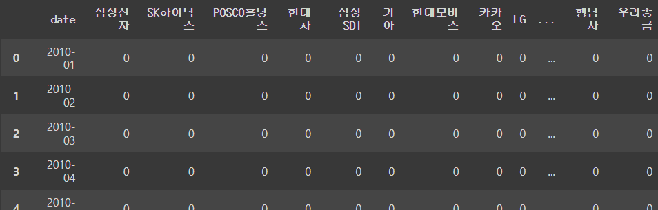 #result is from 2010~2020 # Initialize an new dataframe for makwowitz weight(so except risk free) mk_df = pd.DataFrame(df.iloc[120:][:]) #result of protfolio(so use mk_df and date for r) result = pd.DataFrame() result['date'] = df.iloc[120:]['date'] result['r'] = None result.reset_index(drop=True, inplace=True) #md_df mk_df.drop(['risk_free'], axis=1, inplace= True) mk_df.reset_index(drop=True, inplace=True) mk_df.iloc[:,1:] = 0 mk_dfrisk min을 뺀 stock df를 정의한다(계산의 편의성을 위해)