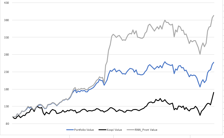 1) 종목선정이 모델에 주는 영향을 최소화하고 2) 전체 시장지수 데이터(KOSPI)와 비교하기 위해
