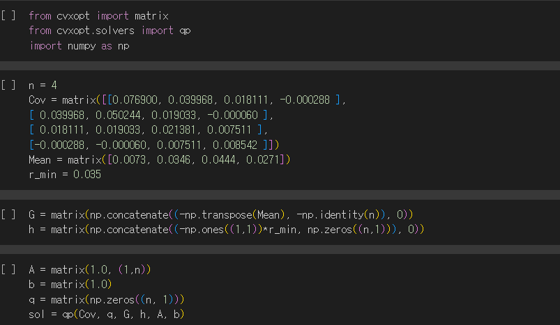 마코위츠 모델의 해를 구하기 위해서는 LP문제를 풀어야하는데(공매도 금지 조건임), 이는 cvxopt를 이용하여 해결하였다. 코드 예시는 아래와 같다