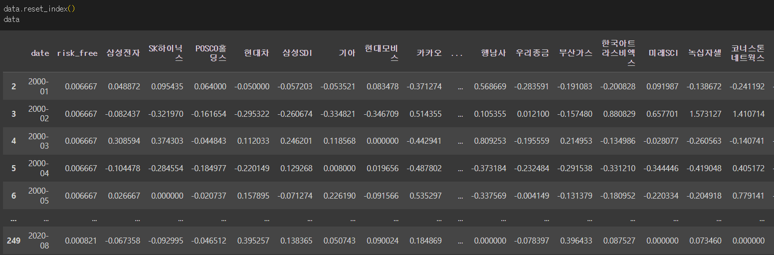수익율 데이터 이후 한국 국채를 기준으로 한 risk free column을 데이터프레임에 추가하는 것으로 데이터 처리를 마무리했다(추가적인 날짜 index를 달로 변경하는 부분은 단순히 문자열 slicing을 통해 해결하였다)
