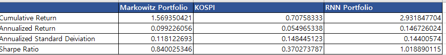 예상했지만, Time series를 이용한 모델이 가장 성능이 좋게 나왔다. 또 그 지표차이가 굉장히 커서(누적 수익율 기준 거의 기존 Markowitz보다 2배) 놀라운 결과였다