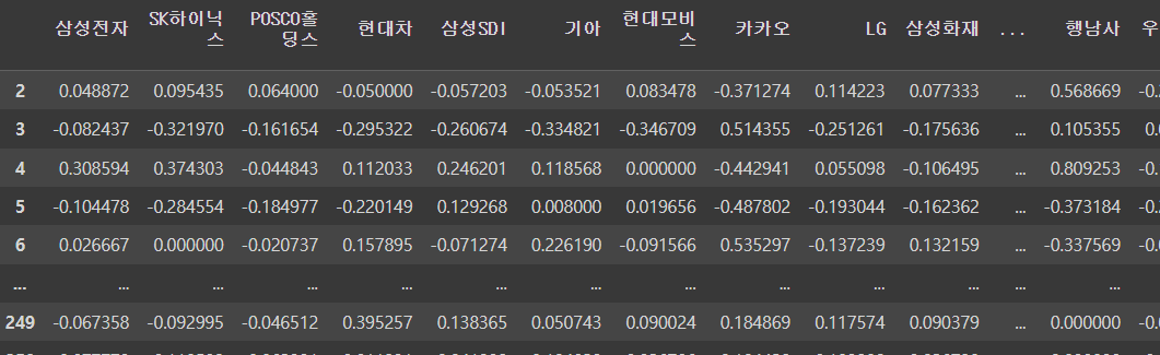 그럼으로 이를 아래 코드를 이용해 같이 수익율 데이터로 변형하였다.