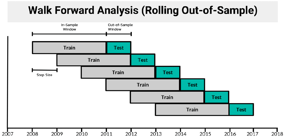 4. 모델의 Train은 2000~2010년도 까지 진행하며, 성능평가는 2010~2020년까지의 데이터를 이용한다. 이 때 backtesting을 진행함에 있어, Walking Foward 방법을 이용한다.
