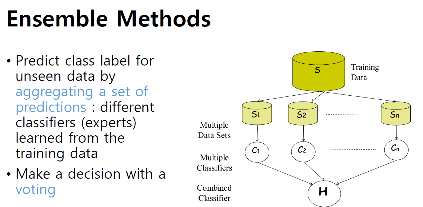 Supervised Learning Task에서 성능을 향상시킬 수 있는 방법으로 다양한 다른 모델을 모아서 예측에 사용하는 방법이다.