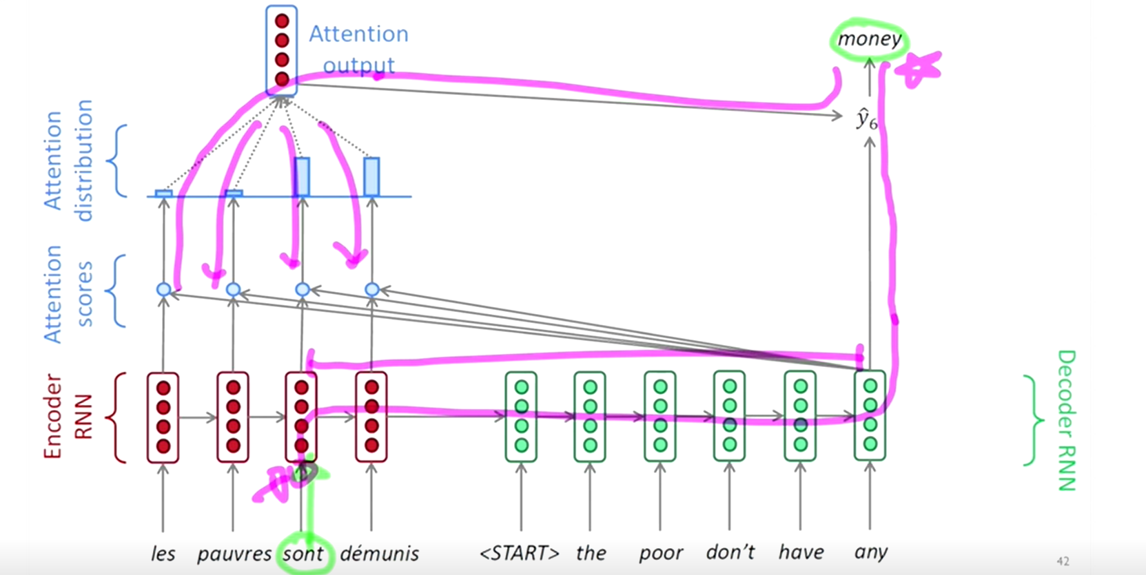 Attention을 통해 추가된 path: 출처) LgAimers 4기 주재걸 교수님 강의 중 발췌 아래의 그림을 보면 decoder에서 어떤 순서로 어떻게 해석을 하는지 조금 시각화해서 볼 수 있다.