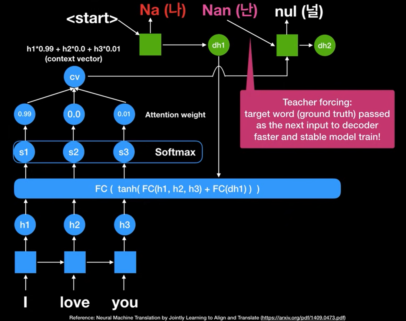 실제로 학습을 할 때, 우리는 기본적으로 이전의 output을 그대로 받아와 sequnce한 예측을 만들어 내는 것이 목적이었지만, Teacher forcing의 경우 Target word 즉, ground truth한 input을 대신 전달함으로서 학습과정에서 더 모델이 빠르고 안정적으로 학습하는데 도움을 주는 기법이다.