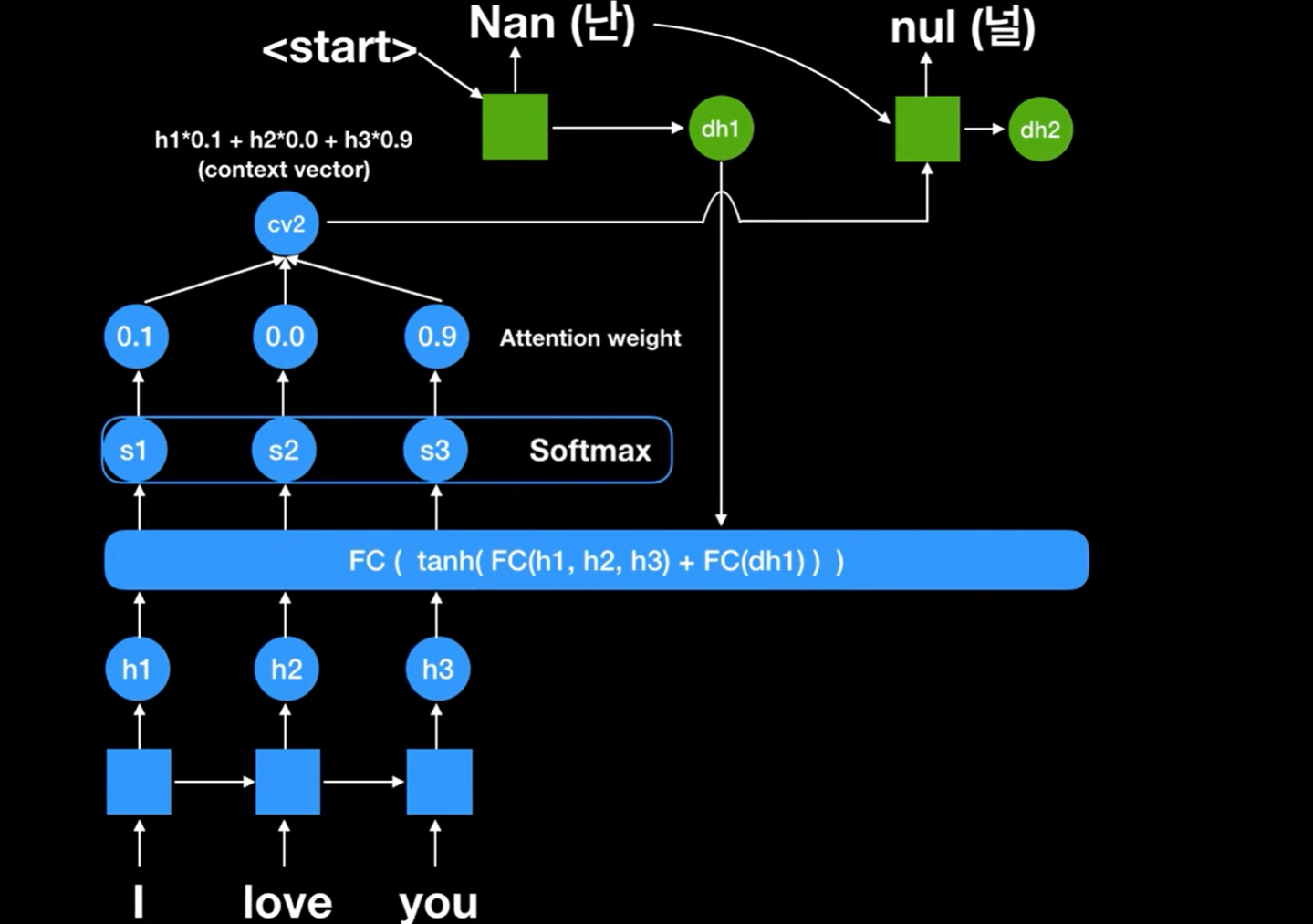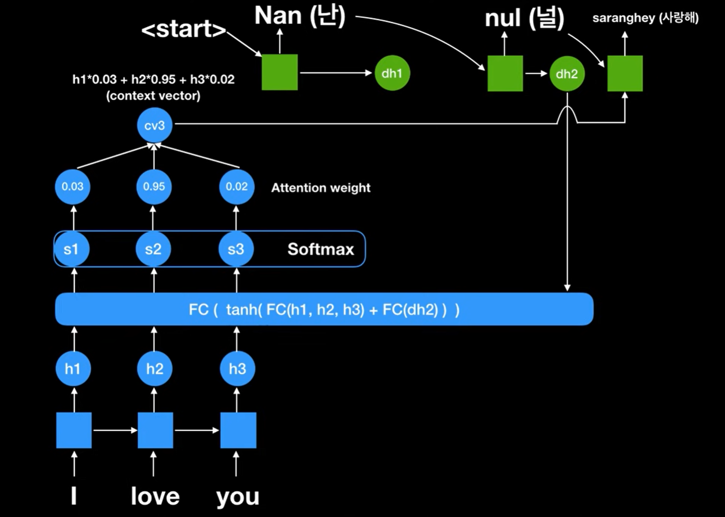 최종적으로 state를 계산할 때, 이전 state와 입력값과 위에서 구한 attention context vector를 이용해 예측에 이용한다.