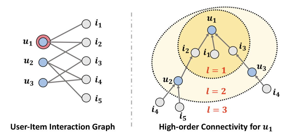https://arxiv.org/pdf/1905.08108.pdf, Neural Graph Collaborative Filtering 조금더 자세히 말하면, NGCF는 유저와 아이템 간의 상호작용을 bi-graph로 만들고 이를 학습한다. 이때, 아이템의 개수가 많아질 수록 각 node가 모든 상호작용을 충분히 반영하지 못하기에. higher order connectivity를 통해 이를 조절하였다(어디까지 볼건지 range정해주기).