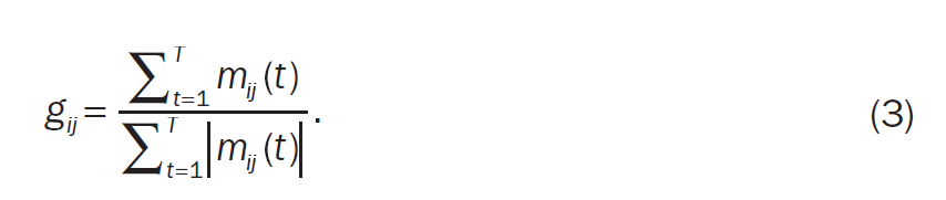 두 구성 요소가 같은 방향으로 이용하면서 임계값을 초과하는 쌍을 Concordant pair라고 하고, 반대 방향으로 이동하면서 임계값을 초과하는 쌍을 discordant pair라고 할때, 시계열 i,j에 개해 일치하는 쌍의 수를 $n^c_{ij}$로 불일치 쌍의 수를 $n^d_{ij}$라고 하면 방정식 3, 기존의 $g_{ij}$ 는 다음과 같이 변형할 수 있다.