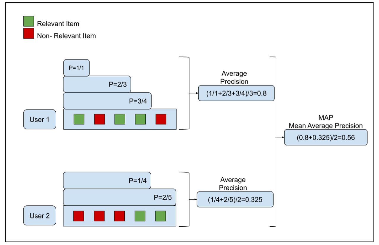 정밀도는 True라고 내가 분류한 것들 중 실제 True인 비율을 의미함으로 아래의 예시에서 사용자가 선호한 초록색 item이 나타낼때마다 그때까지의 정밀도를 계산한다. 이후 이들을 모두 더한 후 선호한다고 한 개수로 나눈다.