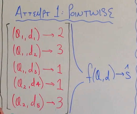 pointwise 방법은 매우 단순한 접근법으로, 간단히 말해 (query, document) 쌍에 맞는 Rank 점수를 예측하는 Regression model을 만든다고 생각하면 된다. 아래 그림의 예시처럼 Scoring를 예측하는 f(q,d) = s 를 잘 학습시키는 것이 목적이다.