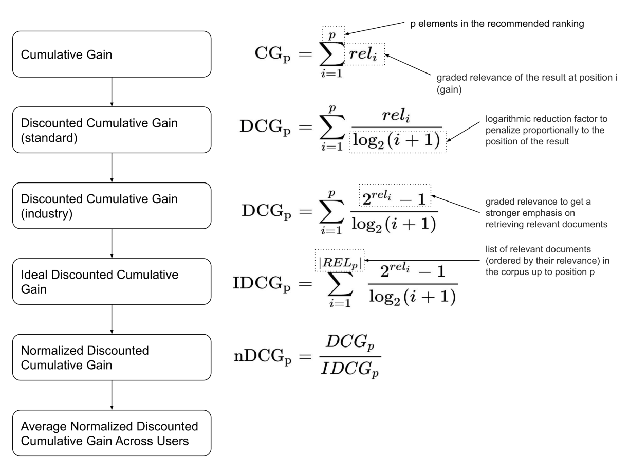 Discounted cumulative gain은 간단히 설명하면 추천결과 중 하위에 추천된 값에 더 적은 gain을 주어 상단에 가중을 주는 방식을 의미하며, normalized ~는 이상적인 DGC인 IDGC(rel 순서대로 추천되었을 때 DCG)로 구한 DCG를 나누는 것이다. 자세한건 아래의 수식을 보자(rel은 얼마나 연관되어있는가, label이랑 같음 클 수록 좋음)