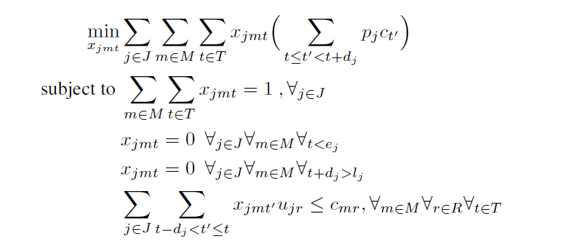 보다 자세히는 J는 M개의 machine에 할당될 작업 집합이며, 이는 R 자원의 요구사항을 유지해야한다.