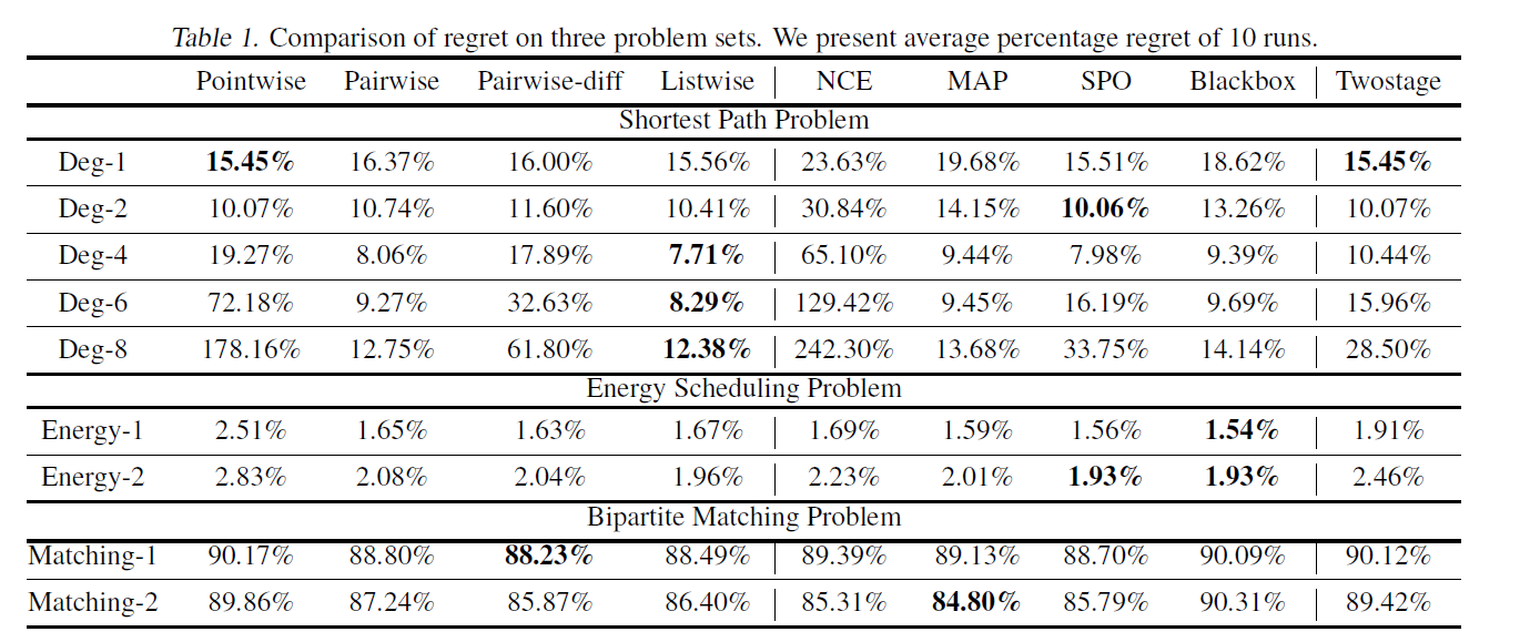 metric으로 percentage regret을 이용한다. 또한 비교는 SPO+ loss (Elmachtoub & Grigas, 2021), Blackbox backpropagation approach (Pogancic et al., 2020) and the NCE and MAP approach of Mulamba et al. (2021)가 사용된다. 또한 Twostage 방법과도 그 결과를 비교한다.