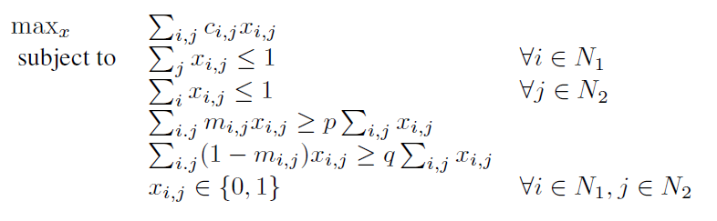 Ferber et al. (2020) and Mulamba et al. (2021)에서 풀어본 문제로 CORA cistatiation network의 데이터를 이용한 문제이다. 100개의 노드를 두개의 노드인 50개씩으로 나눈다. 보상행렬 c는 두 노그 간의 링크가 존재할 가능성을 나타낸다. n은 기사 i와 j가 같은 주제를 공유하면 1이고 아니면 0이다. p와 q는 각각 유사성과 다양성을 제약한다. 각 N1, N2의 노드는 최대 하나의 노드와 매칭된다. x는 이진변수이다(0,1).