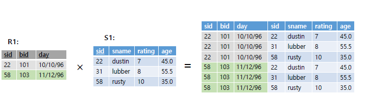 Cross Product, R X S는 each row of R와 S의 row로 가능한 모든 가능한 조합을 뽑아낸다. 최대 R과 S의 Cardinalty의 곱의 개수가 존재가능하다. Compatiblity를 만족할 필요 없고, Duplicate한 경우는 생성되지 않는다(만일 R과 S에 공통 속성이 있는 경우 둘 중 하나의 이름을 재정의해야한다고 한다)