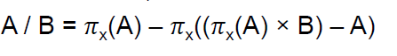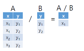 Division 연산의 의미는, A에 있는 모든 x 값이 B에 있는 모든 y 값과 매핑되는 경우에만 결과에 포함된다는 것이다.