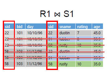 아래의 예시를 보면 sid를 공통속성으로 하여 결합하는 것을 확인 가능하다(겹치는 22, 58만 가져옴) 또한, sid열이 동일한 이름으로 두번 포함되어있기에 rename이 필요함을 확인가능하다.