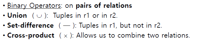 기본 연산자: 선택(σ), 투영(π), 합집합(∪), 차집합(-), 카티션 곱(×) 등을 사용한다