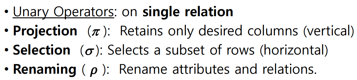 단항연산은 single relation에 관해서만 수행된다.