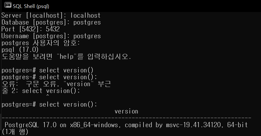 그대로 기본값들을 입력한뒤, 비밀번호를 입력하면 psql의 버전이 뜬다.