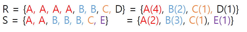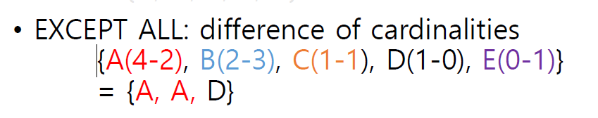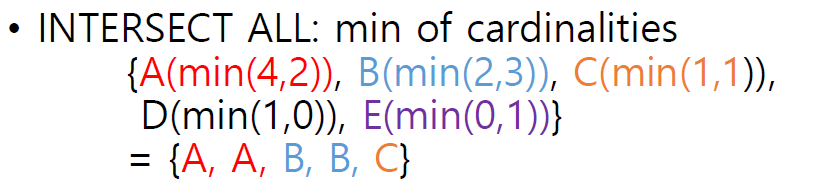 하지만 multi set sementic에서는 중복을 허용하기에 아래와 같이 연산이 되며, 이때 ALL을 뒤에 붙여준다. 즉. 아래와 같이 원소의 개수를 따지면서 연산 또한 다음과 같다.