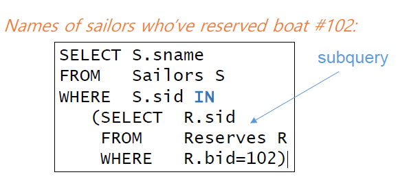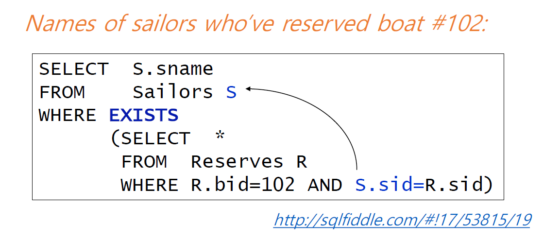 위의 예시는 102를 빌린 sid가 있는지 확인하는 쿼리 문으로 서브쿼리와 함께 사용되었다.