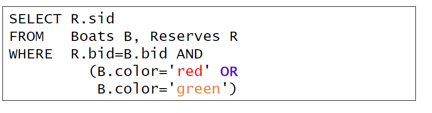 - Find sid’s of sailors who’ve reserved a red or green boat