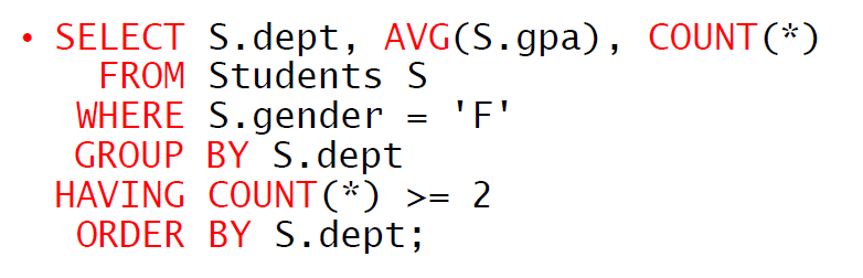 HAVING은 group을 필터링해서 알려준다. Grouping 이후의 값을 계산한다. HAVING은 aggregate quires 이후에만 사용 가능하다. WHERE과 HAVING은 차이는 WHERE은 그룹이 되기 전에 데이터를 필터링하고 HAVING의 경우 그룹화 후의 데이터를 필터링한다.