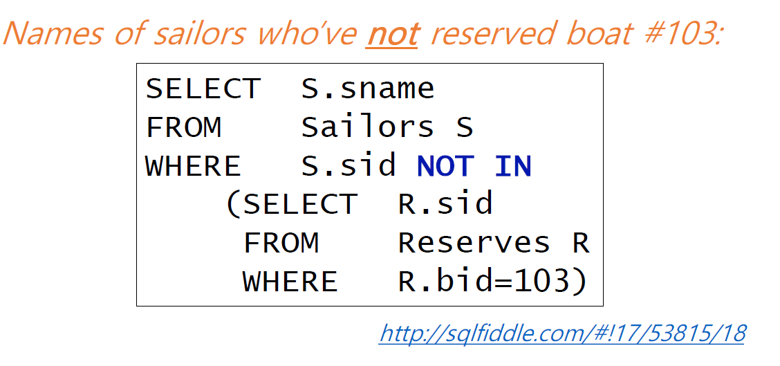 위의 예시는 반대로 103을 빌리지 않은 s.name을 찾으며 이는 서브쿼리 안에 해당 sid가 없는지를 확인한다.