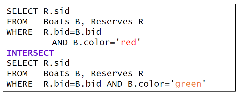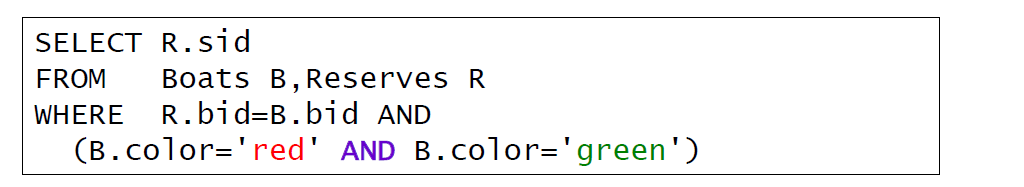 - Find sid’s of sailors who’ve reserved a red and a green boat