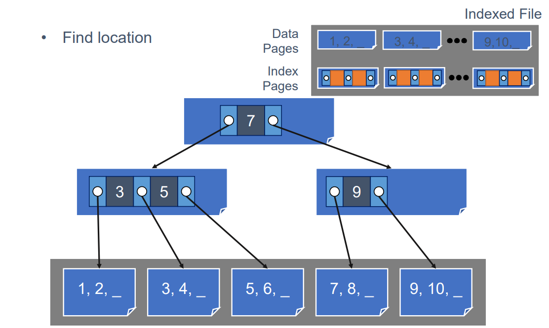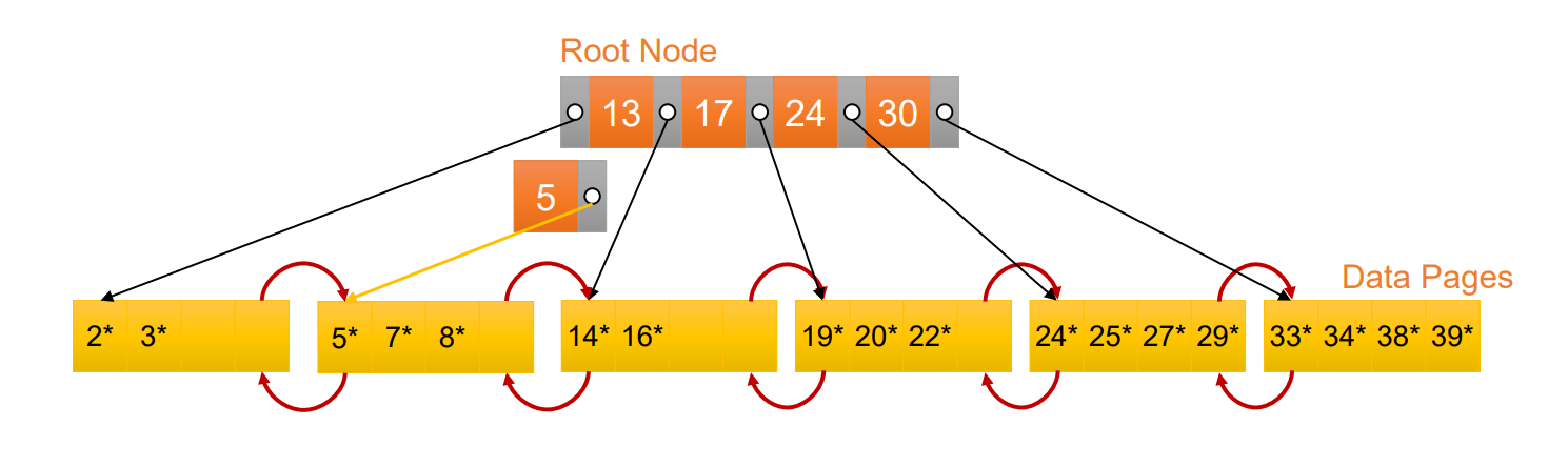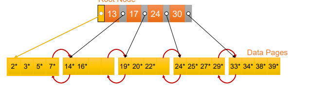 위의 그림은 키에 의해서 정렬된 (키, 페이지 id)의 인덱스 구조이며, 실제 데이터보다 더 적은 양의 데이터로 페이지를 가리키게 된다. 키보다 같거나 작은 값은 왼쪽에 같거나 큰값은 오른쪽에 저장된다. 데이터 검색 시 루트 인덱스부터 시작해서 아래로 내려간다.