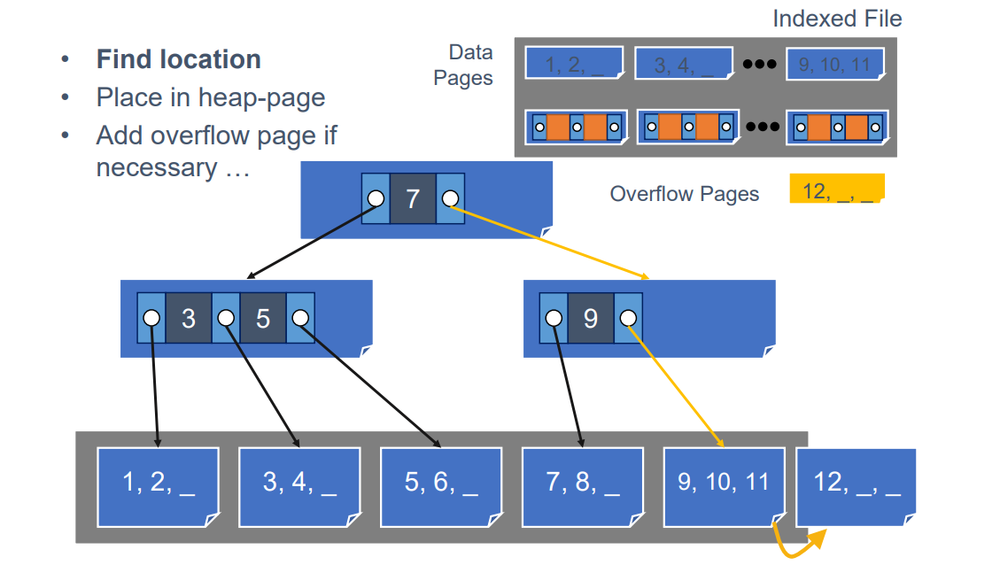 만일 데이터를 더 추가한다고 가정해보자. 만일 11과 12를 추가한다면 11까지는 괜찮지만 12는 overflow가 나게 됨으로 새로운 페이지를 생성후에 바로 직전 페이지를 통해 이를 가리키게 한다. 물론 이럴 경우 데이터 추가가 많이 일어날 수록 linked list 형태가 됨으로 접근에 비효율적이라는 문제가 있다.