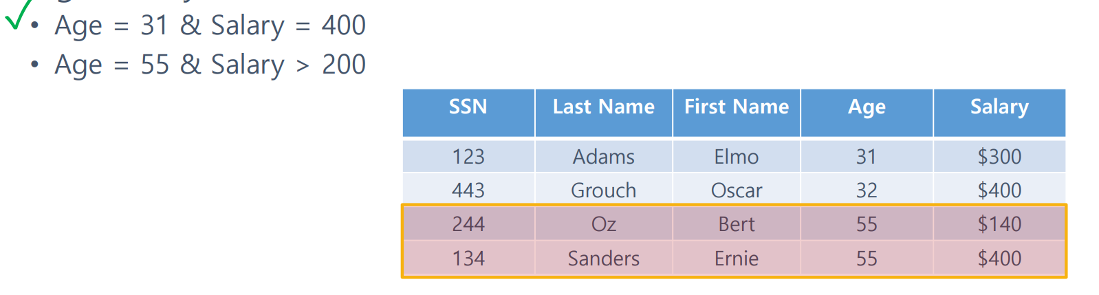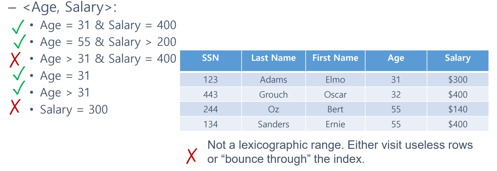<AGE, SALARY>에 관한 복합 인덱스가 있다고 가정하자.